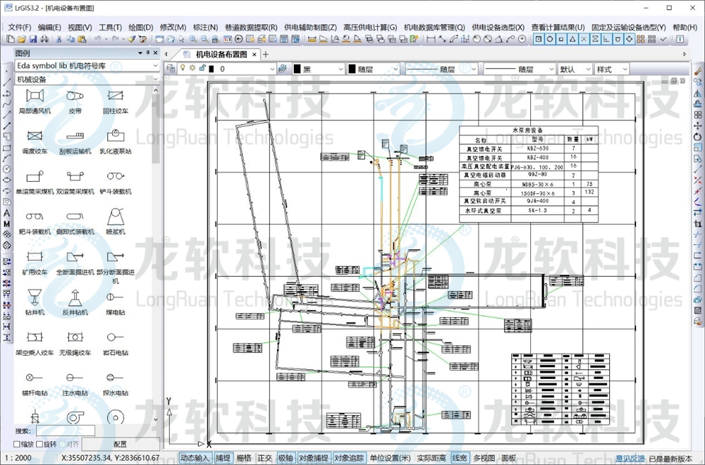 供電設計圖形協同管理系統包括機電圖形協同管理、供電設備選型計算和固定設備選型計算等模塊。機電圖形協同管理是基于一張圖管理模式,以在線協同的方式設計運輸系統圖、設備布置圖、供排水系統圖、通訊聯絡系統圖、人員定位系統圖、供電系統圖等機電圖形。供電設備選型計算是基于標準的供電設備圖例庫繪制供電系統圖,對電動機、變壓器、電纜、各類開關進行相應的供電計算與校驗,從設備參數數據庫選出合適的供電設備,并自動生成供電設計報告。固定設備選型計算是對輔助運輸巷絞車、運輸機、排水等設備進行選型計算,選出合適的設備,生成相應的設備選型設計報告。