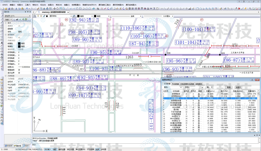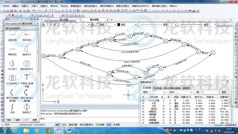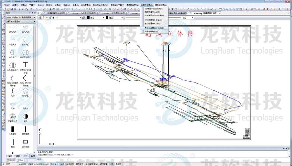 通防圖形協同管理系統主要包括通風制圖和通風系統仿真等模塊。通風制圖包括繪制通風系統圖、避災路線圖、注漿系統圖、瓦斯抽放系統圖、瓦斯抽放曲線圖、防塵系統圖、防火系統圖、監測監控系統圖,自動生成通風系統立體圖、通風網絡圖、通風系統壓能圖;通風系統仿真主要包括通風阻力測定數據的錄入和處理,通風網絡模擬解算,通風系統風量調節,風機優化選型等功能。